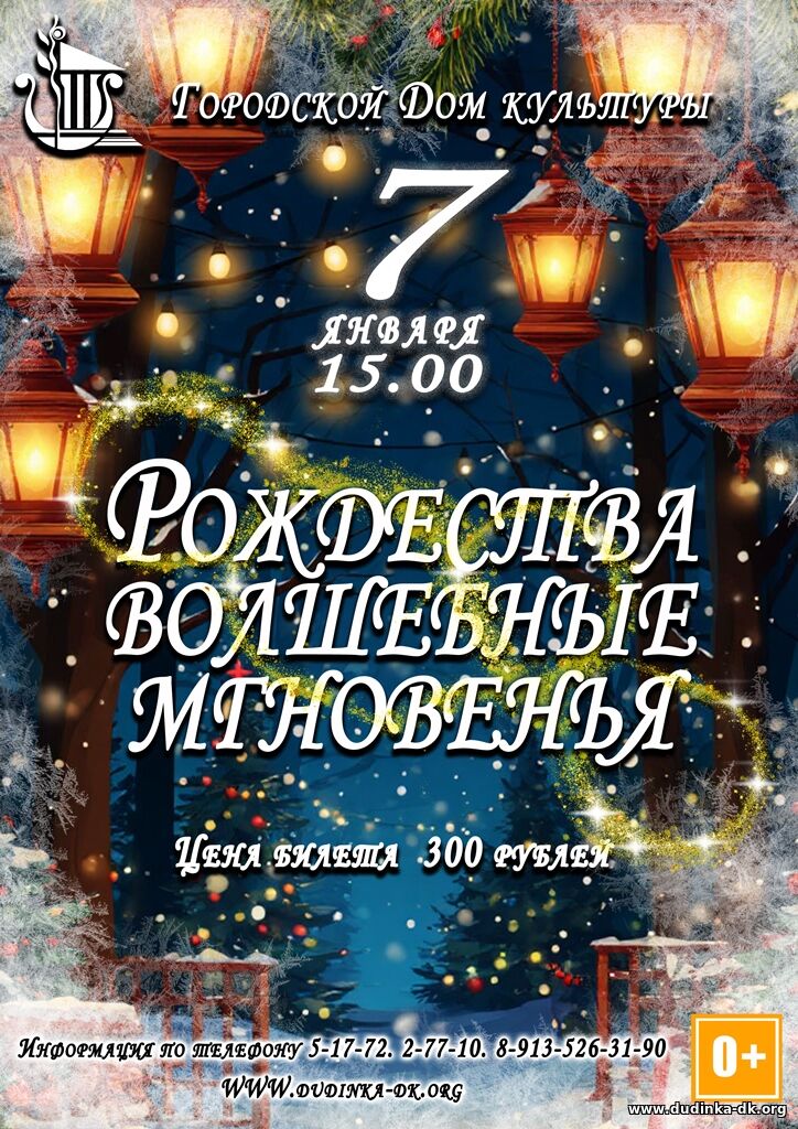 Городской Дом культуры приглашает дорогих зрителей отметить этот прекрасный день праздничным концертом «Рождества волшебные мгновенья» и окунуться в атмосферу чудесного праздника!